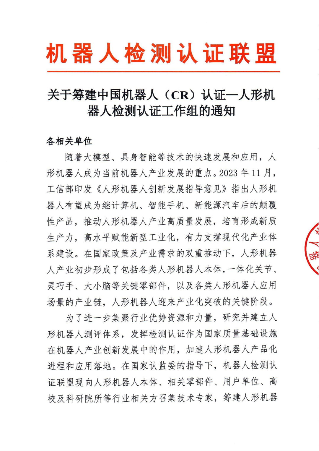 关于筹建中国机器人(CR)认证——人形机器人检测认证工作组的通知.pdf