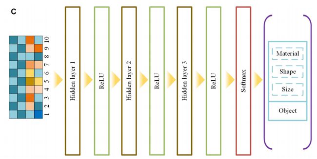 机器手上的传感器信号图,会被作为多层感知器的输入信息,输出信息则是尺寸、形状和物体的材料。