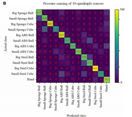 比如说在物体分类识别时,仅使用材料导热率来感知,其识别精度可达 69.6%,但这时的缺点在于不能区分材料相同、而形状和大小不同的物体,如小海绵球和大海绵球。