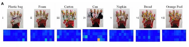 当把传感器搭载到机器手上,并结合触觉感知信息和机器学习之后,机器手就能精确识别不同形状、大小和材料的物品,其中对于七类垃圾物品实现了高准确识别,其识别率可达 94%。