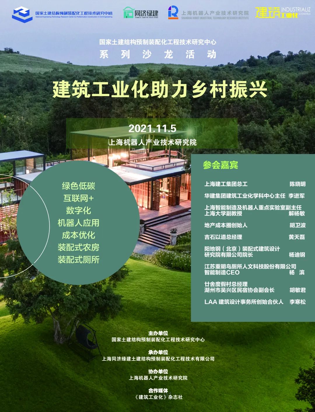11月5日,由同济大学国家土建结构预制装配化工程技术研究中心(后简称“国家中心”)主办、上海同济绿建土建结构预制装配化工程技术有限公司(后简称“同济绿建”)承办、710公海寰宇(中国)机器人有限公司官网(后简称“710公海寰宇”)协办的“建筑工业化助力乡村振兴”沙龙活动在上海举行。710公海寰宇院长黄慧洁出席沙龙并致辞,同济绿建总经理刘青主持开场。