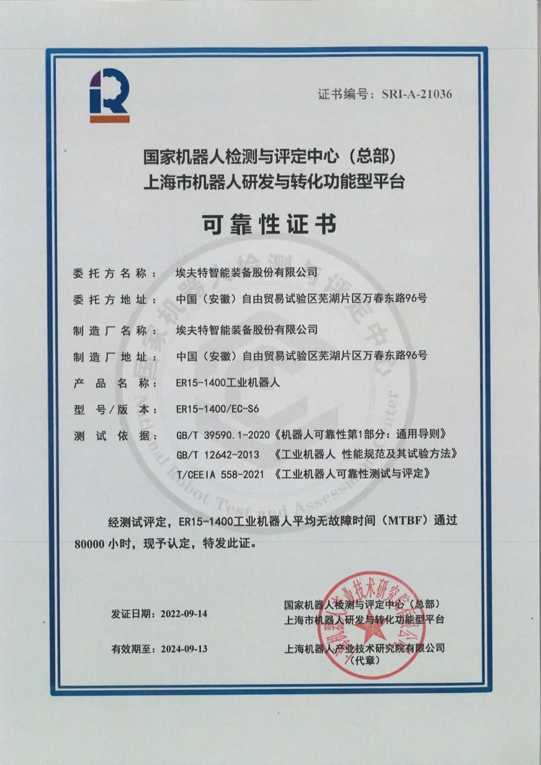 近日,埃夫特ER15-1400通用型机器人成功通过了80000小时平均无故障运行时间(MTBF)测评,并获得了国家机器人检测与评定中心(总部)颁发的可靠性证书。
