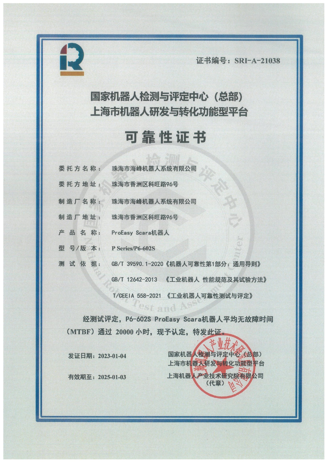 1月3日,珠海市海峰机器人系统有限公司的ProEasy 机器人P6-602s SCARA机器人顺利通过710公海寰宇(中国)机器人有限公司官网的MTBF 20000小时测评。