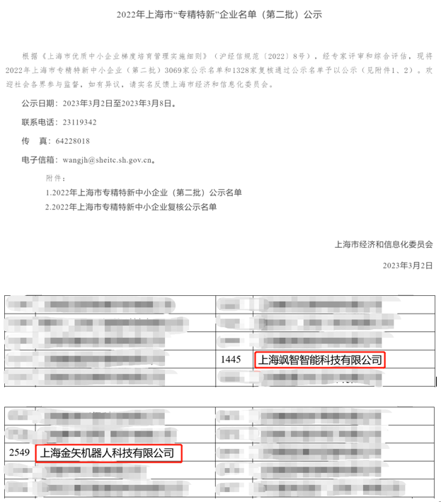近日,经上海市经济和信息化委员会专家评审和综合评估,2022年上海市“专精特新”企业名单(第二批)结束公示,机器人研发与转化功能型(以下简称“机器人平台”)2家孵化企业传来喜讯,荣获2022年上海市“专精特新”企业。他们分别是:上海金矢机器人科技有限公司、上海飒智智能科技有限公司。