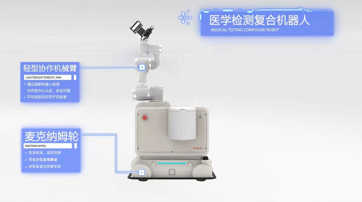 医学检测复合机器人采用麦克纳姆轮底盘搭载轻型协作机械臂的形式,其凭借轻巧的机身与灵活的底盘能够在实验室等狭窄区域内进行移动作业,并满足边充电边工作的需求,实现24小时不间断运转。复合机器人具有360度旋转,导航定位、任务规划、视觉精准定位、全向安全避障等功能,同时配有激光雷达、超声波、安全触边、安全急停等多种保障方式,为搭建各类型人机协同医学检测环境奠定了基础。